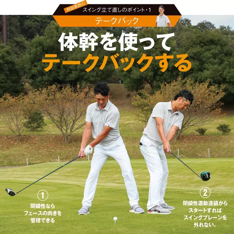 手先でクラブを動かすテークバックは解放性運動連鎖。始動の段階でフェース面を管理できなくなる。