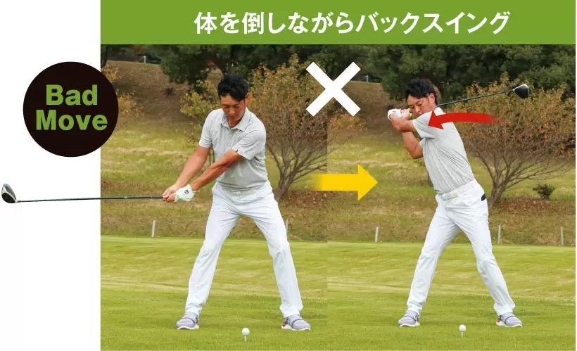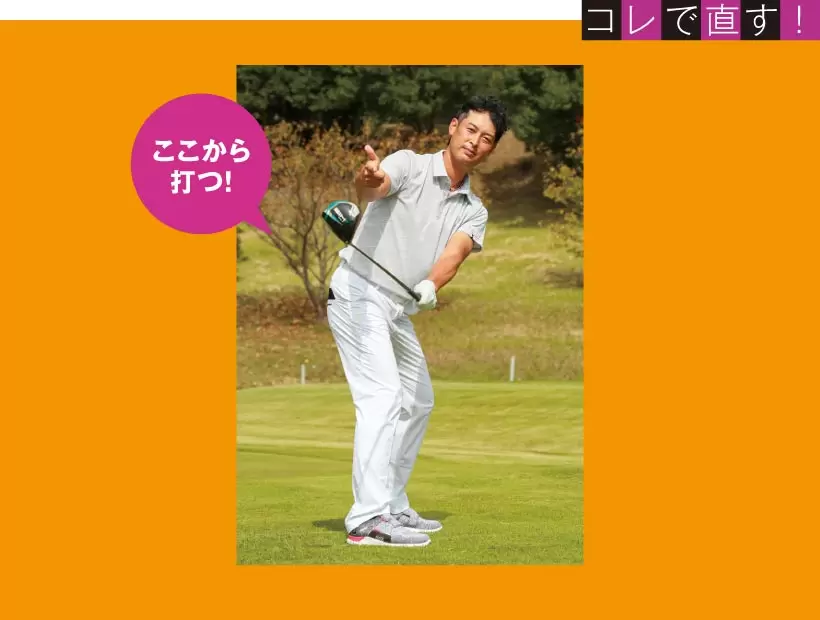 クラブを下ろす過程では背すじを伸ばす。これによりクラブと体が引き合う格好になり右肩が前に出ない。