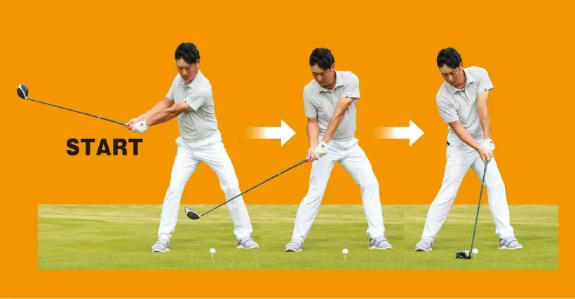 解放性運動連鎖によって得られる慣性をインパクトに生かすには、骨盤を後ろに引いてクラブと体が引き合う形を作る。