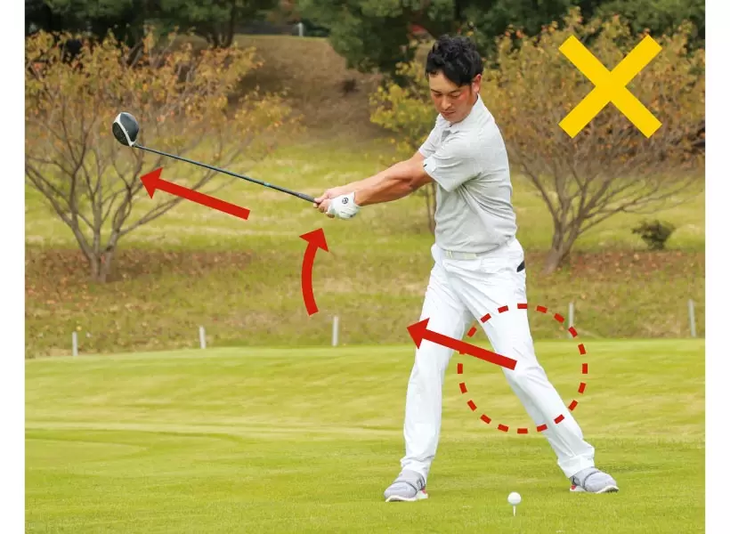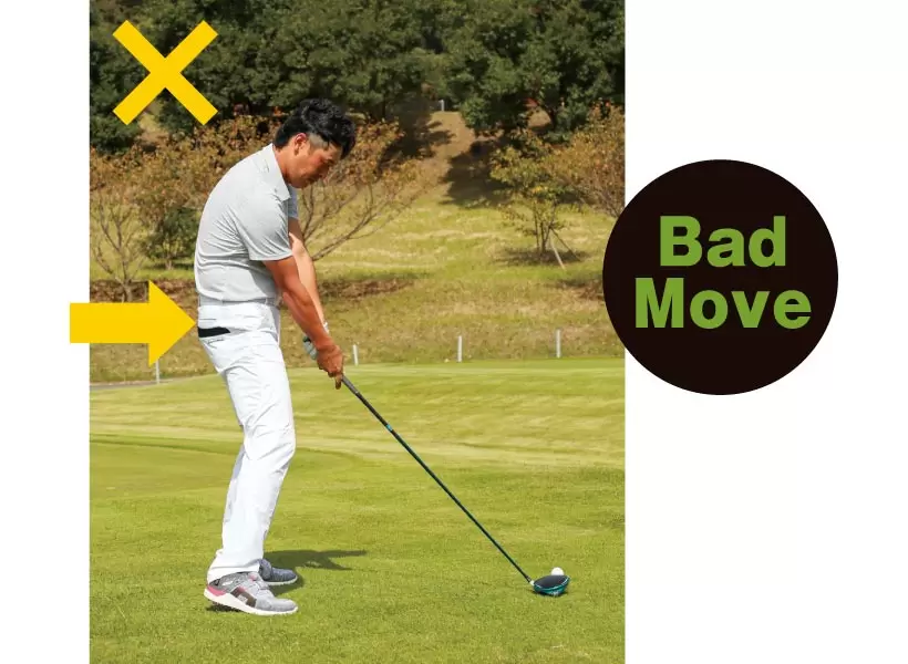 骨盤が前に出るとクラブと引き合う格好にならずスライスが出やすくなる。