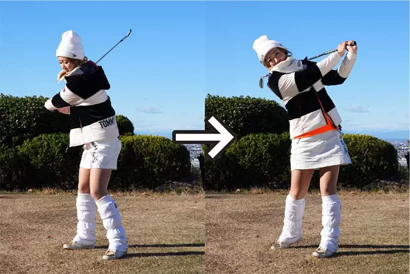 手首がよくほぐれてきたら、カラダの回転も入れてスイングしましょう。
