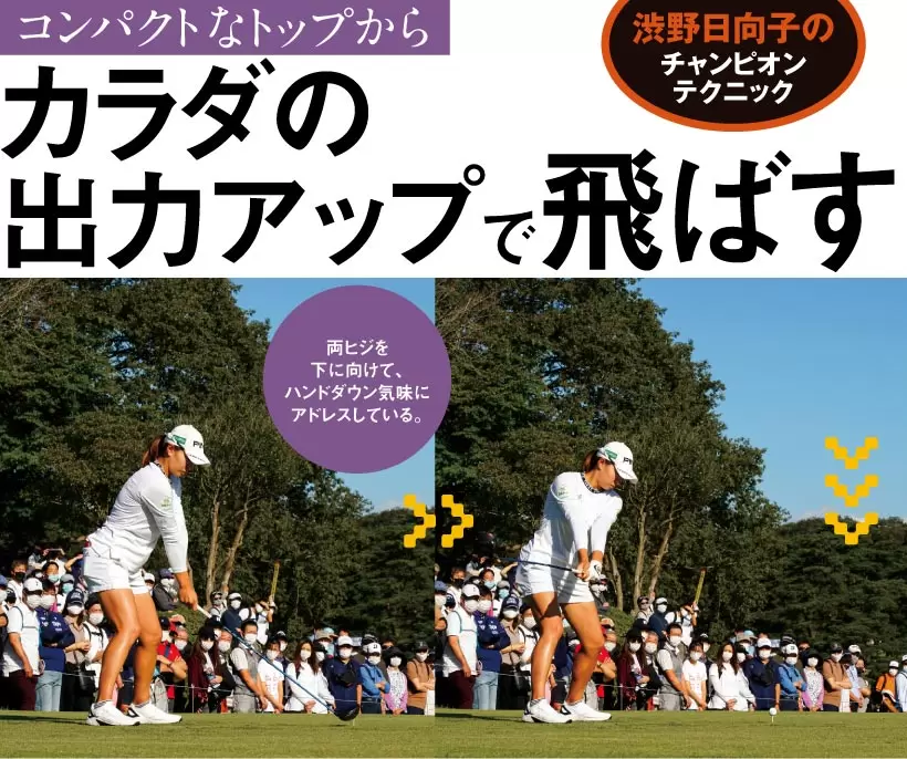 下半身がどっしりして、体幹に軸をイメージさせるような安定感のあるアドレス。/POINT 両足をしっかり踏ん張っているからトップに力感が見られる