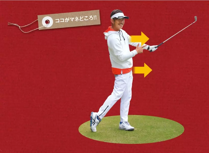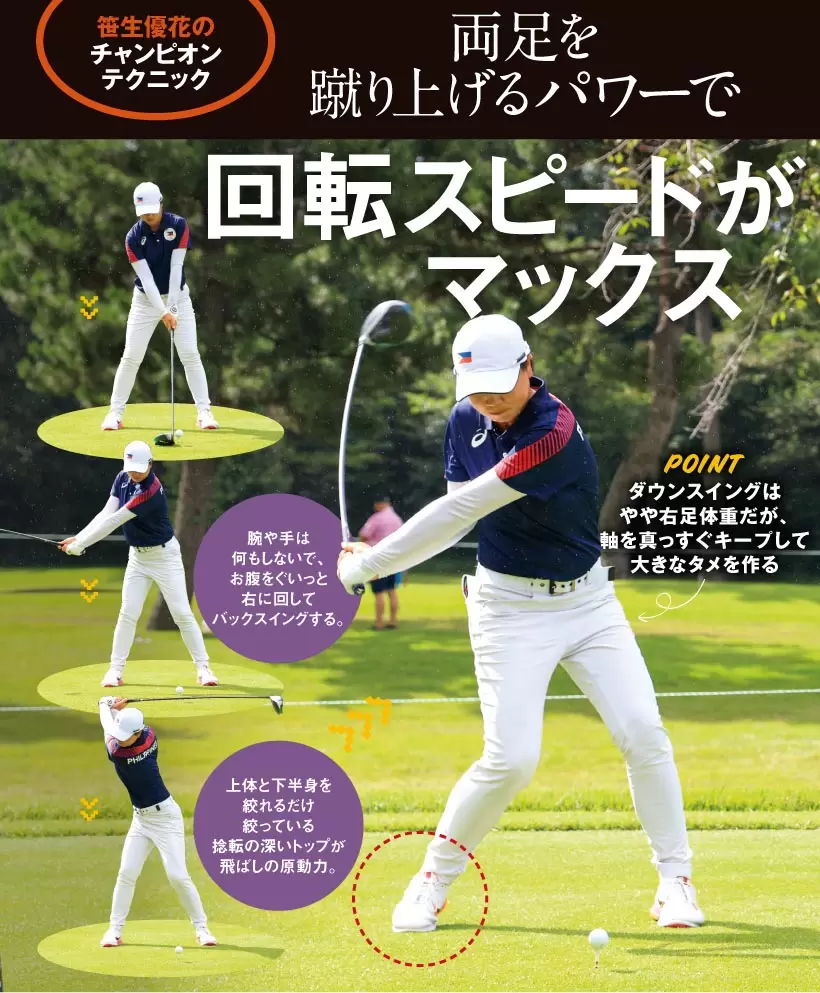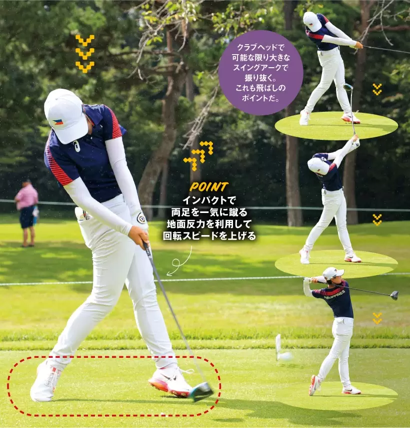 POINT インパクトで両足を一気に蹴る地面反力を利用して回転スピードを上げる/クラブヘッドで可能な限り大きなスイングアークで振り抜く。これも飛ばしのポイントだ。
