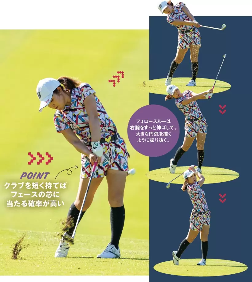 POINT クラブを短く持てばフェースの芯に当たる確率が高い/フォロースルーは右腕をすっと伸ばして、大きな円弧を描くように振り抜く。