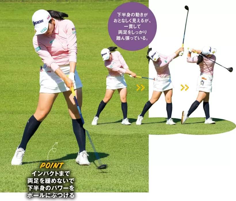 POINT インパクトまで両足を緩めないで下半身のパワーをボールにぶつける/下半身の動きがおとなしく見えるが、一貫して両足をしっかり踏ん張っている。