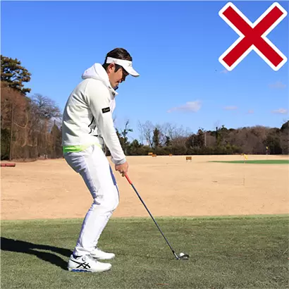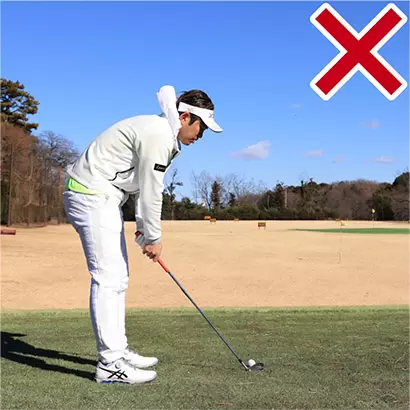 前傾角度が深すぎて背中が丸くなったアドレスもNG。スイング中にカラダが上下動しやすい。