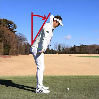 クラブを背中側に押して、軽くお辞儀するように上体を軽く折り曲げる。