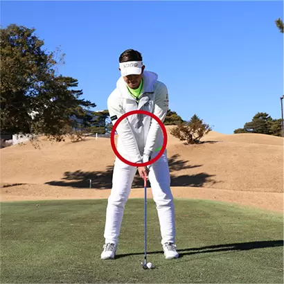 アドレスでお腹に力を入れておくとスイング中の上下動を防げる。