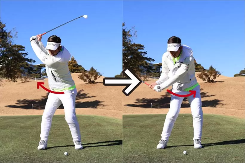 バックスイングでお腹を右に回し、ダウンスイングはお腹を左に回そう。