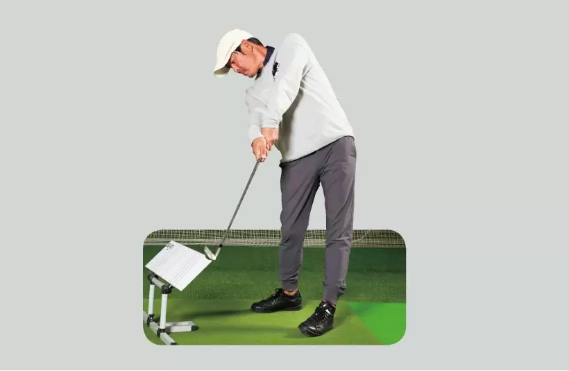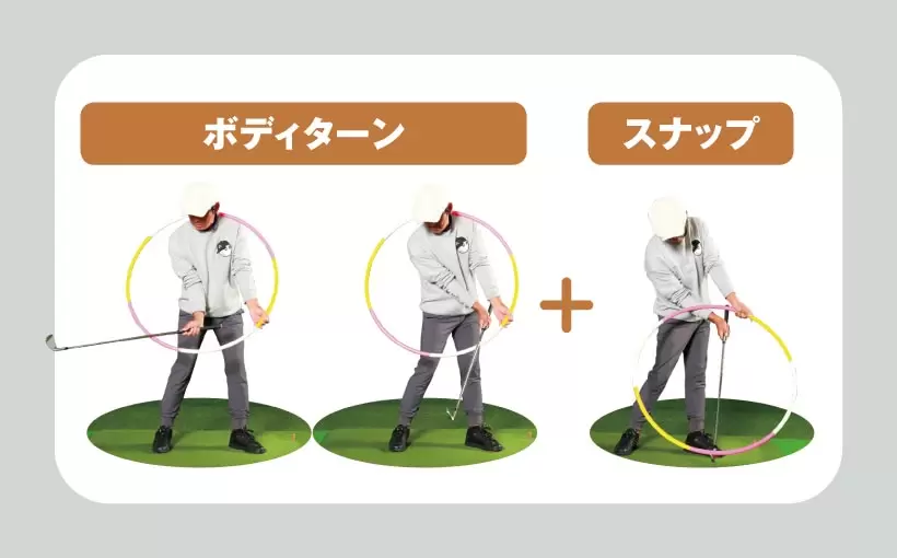 ボディターンの手元の軌道の最下点は、首の下。手首のタメをキープしたままだと、ヘッド軌道の最下点も首の下になるはず。だが、その直前からスナップでリリースを始めると、ヘッドはさらに低く動く。