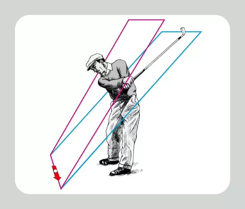 手元の中心(イラスト青丸)が最下点(首の下)から上昇しつつ、グリップエンド(イラスト赤丸)を引きつけることで、ヘッドは本来の円弧より内側を通り、直線に近い動きになる。「実際には、インパクト前後の10センチくらいですが、それで十分です」