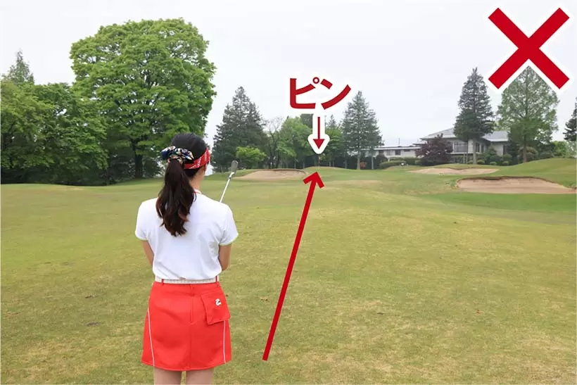 ピンの位置が左で、グリーンの左手前はアゴの深いバンカー。こんな場面でピンを狙うのは危険だ。