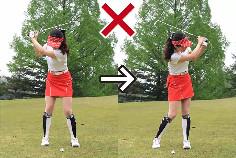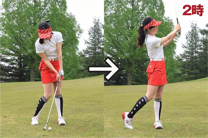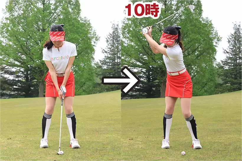 スタンスを狭めにし、ボールの位置はスタンス中央。バックスイングは左腕が10時の高さが目安となる。