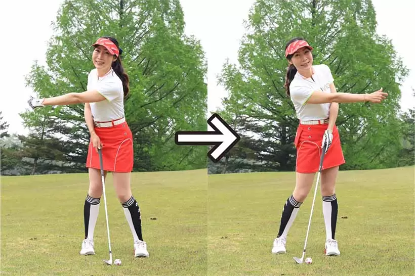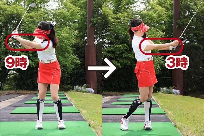 バックスイングは左腕を、フォロースルーは右腕を自然に伸ばそう。