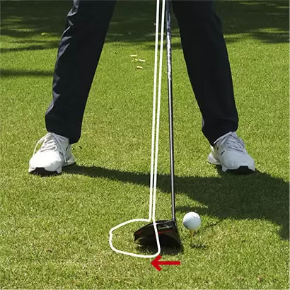 ボールの近くにクラブヘッドをセットするならフェースが少しかぶって見えるのが正解。ボールから少し離して構えるのが合理的と言える。