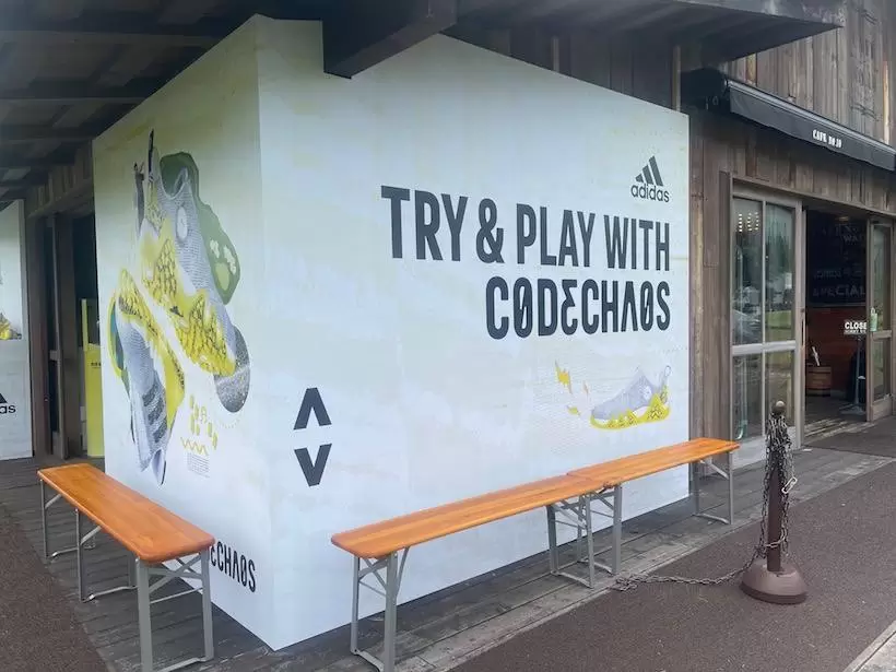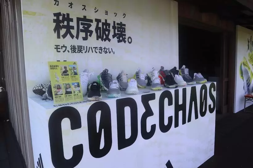 コードカオス22を履いた人から「よかったよ!行って来なよ」と促されてフィッティング・ブースを訪れたゲストも多く、コードカオスブースは一時、人が入りきらなくなり、外のベンチでフィッティングを行うほどの盛況ぶりだった。