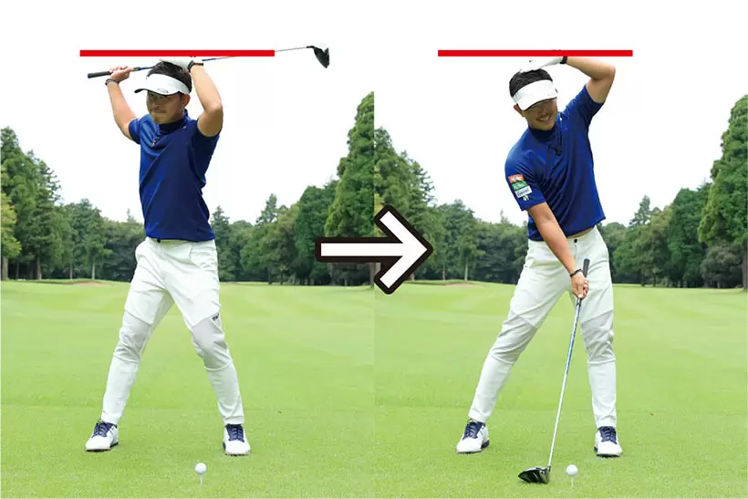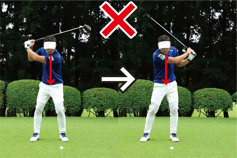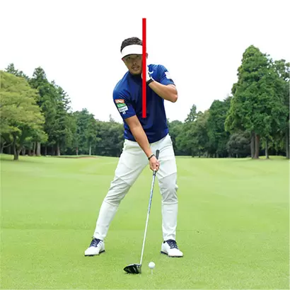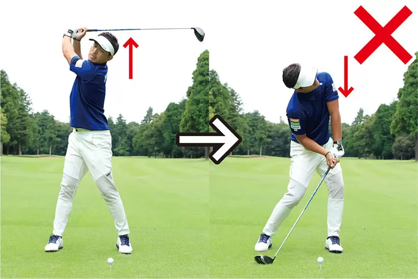 バックスイングで上体が起きるとダウンスイングで沈んでしまう。この頭の上下動は絶対にNG。