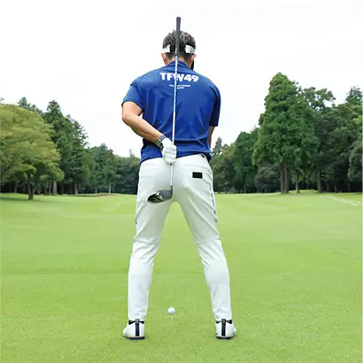 バックスイングで軸をキープしてカラダを回転。軸が動かなければ顔が少し動いてもOK。
