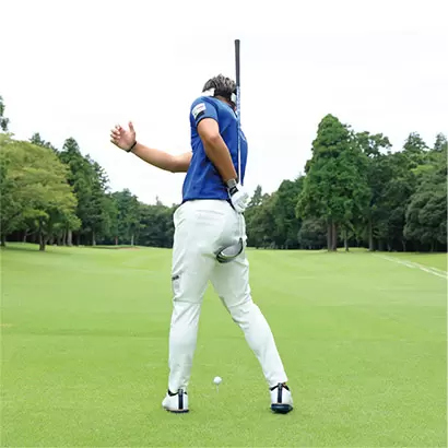 ボールを打ち抜いた後はカラダの回転にしたがって上体が自然に起き上がる。