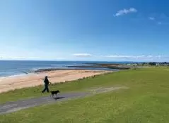 スコットランドのゴルフ場で犬と散歩を楽しむ人々