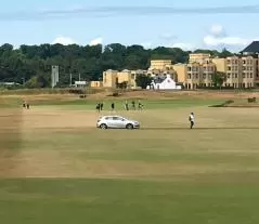 セント・アンドリュースオールドコースの1番ホールを横切る車と人。奥にはセカンドショットを打とうとしているプレーヤーが見える。