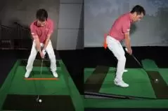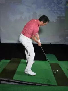スタンス幅を広くとって下半身を安定させたら、ヒザを曲げ、お尻を下に落としてヘッドをボールに近づける。傾斜がキツくなるほどボールを右に寄せて立つ。