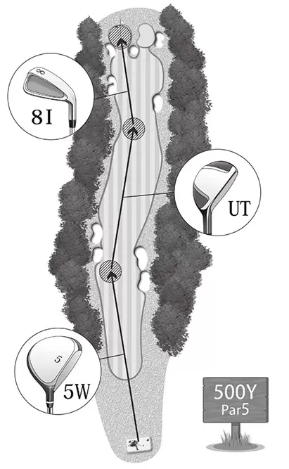 飛ばす必要がないと思えばマネジメントがしやすくなる。500ヤードくらいの長いパー5ホールなら4オンのボギー狙いもOK。ミスなくプレーできたらパーセーブも十分可能だ。