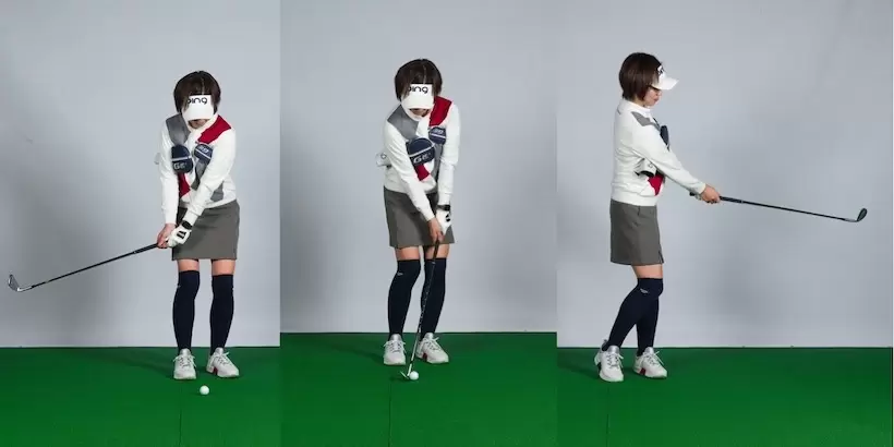 フォローからフィニッシュでも手がリード。手元が体から遠く離れてワキが空く格好になっていた。