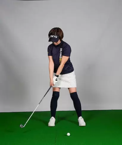 アドレスでバランスよく立つのもポイントのひとつ。ツマ先側、カカト側と交互に体重をかけ、バランスよく立てる重心位置を見つけよう