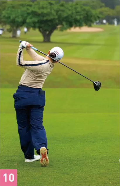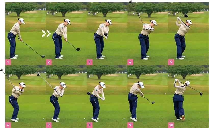バックスイングでは左腕が伸びていて、フォローでは右腕を伸ばしているので、大きなスイングアークで飛ばすことができる。