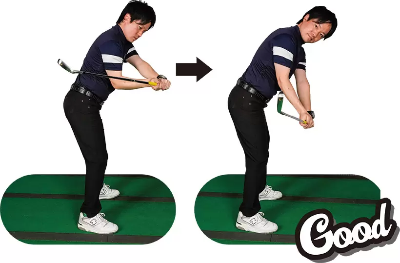 (写真左)左腕をネジり左手首が曲がってしまっている! (写真右)テークバックには左腕のネジりも手首の曲がりも不要です!
