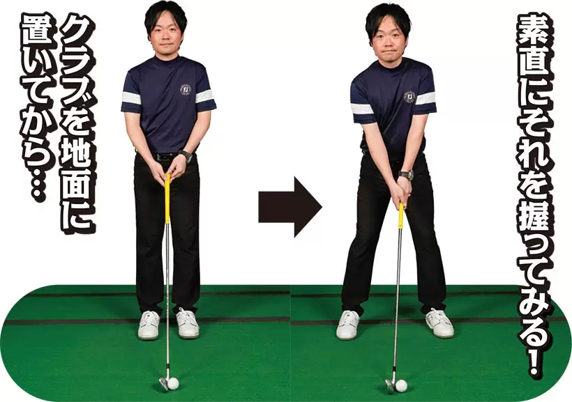 (写真上)腕をネジったテークバックの代償としてダウンではフェースが開いている!(写真下)腕をネジらなければフェースはスクエアに正しく下りてくる!