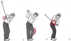 (左)シャフトを立てるイメージで振り上げるニック・プライス。クラブが軽く感じられ、スムーズに動かしやすい。右ヒジは絞り込まず、叩けるトップをイメージして折りたたんでいく。(中)軽いヒールアップで左ヒザを前方に出し、切り返しで踏み込む体勢を整える。ヒザは左右ではなく、前後に動かすイメージでボディターンを促している。(右)左足の踏み込みと同時に、右ヒジをタックインしてシャフトを寝かし、理想的なスイングプレーンに乗せる。ヘッド軌道は、右手で叩くイメージで最短ルートを描くようになる。