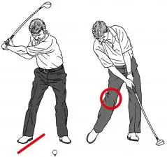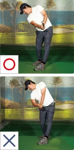 (左)プライスはクローズドスタンスと合わせて右足を開く。バックスイングでのターンを促し、ダウンでの右ヒザの動きすぎも抑えられる。(右)切り返しの左足の踏み込みで左へのターンを促しつつ、右手で叩いていく。右ヒザが左に突っ込まないことで、右手とクラブの通り道ができている。