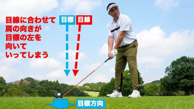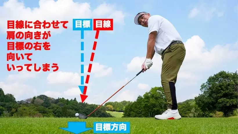 この状態から目標を見るとターゲットラインと視線が交差し、目標方向に肩のラインを向ける形となってしまい、目標の右を向いて構えてしまう。