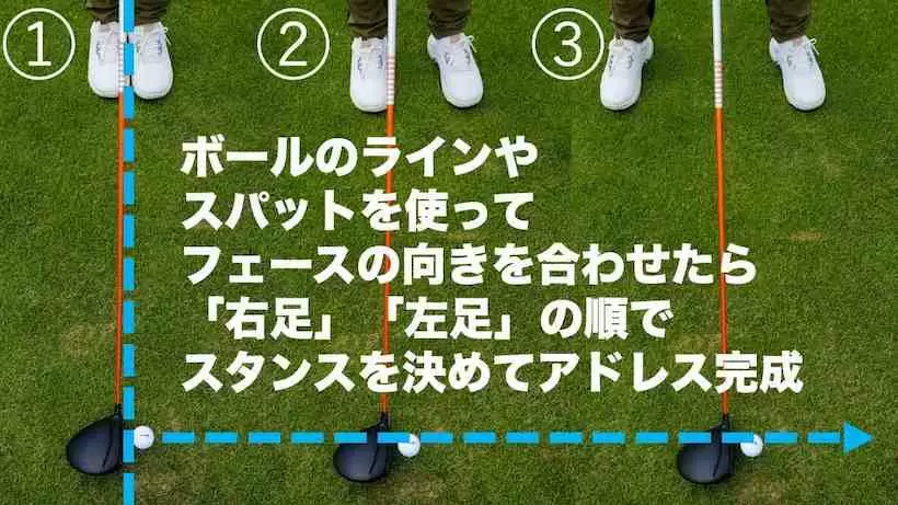 アドレスの状態から体・頭を起こして目標を見ると、徐々に肩のラインが左を向いていく。視線は目標だが、左を向いた肩のラインに合わせてスタンスも微調整するので目標の左を向くことになる。