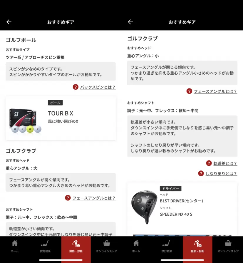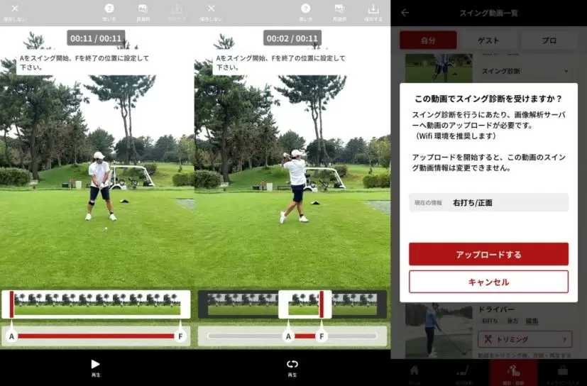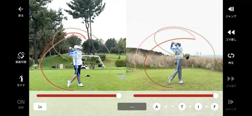 「診断終了」の通知が来たら「A」(アドレス)、「T」(トップ)、「I」(インパクト)、「F」(フィニッシュ)の位置を確認して診断結果へ。