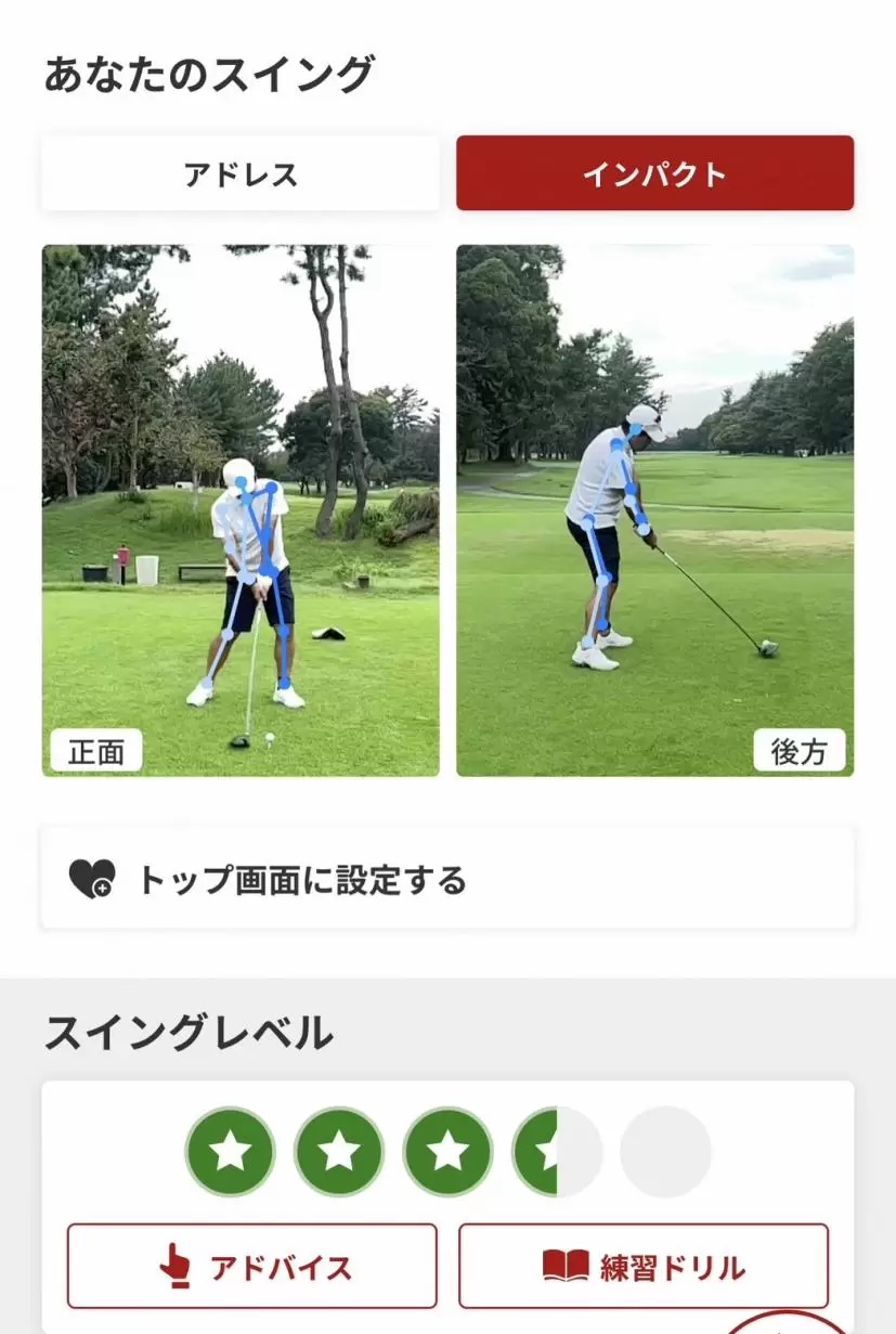 セットスイング診断で「3.5」を獲得! 新機能では10点満点の0.5点刻みで採点される。