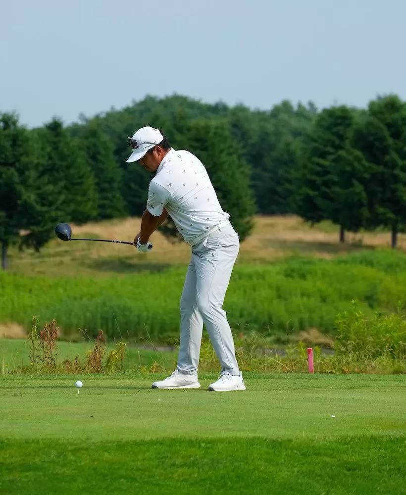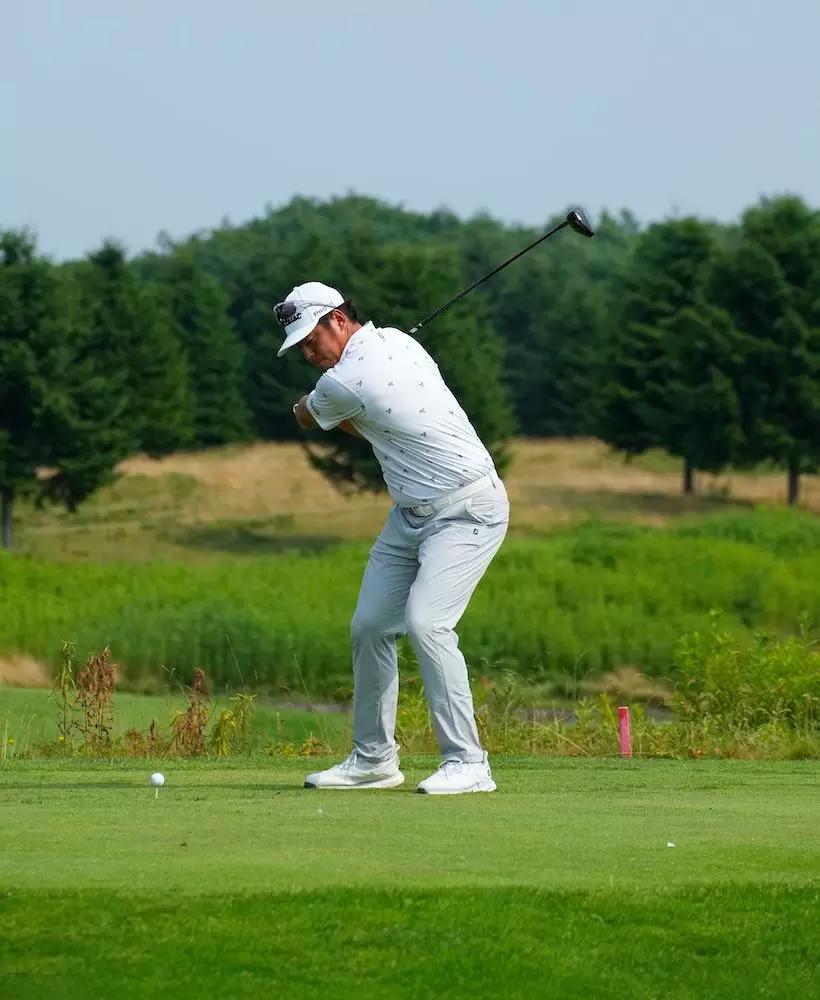 上半身をしっかりとネジって、下半身との捻転差をつくり、飛ばしのためのパワーを蓄える。