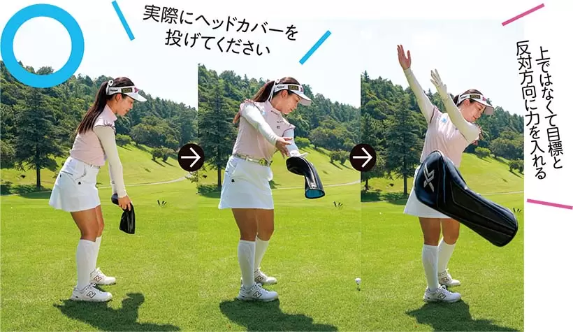 (写真左)テークバックで左ヒジを曲げたり、手首をヒネッてしまうタイプがヘッドカバーを投げると背中側に飛んでしまう。(写真右)前傾角度がキープできずに、両肩が同じ高さになっしまうとヘッドがインサイドに上がってしまう。