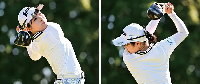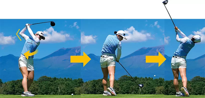 (写真左)バックスイングでは上体を捻転し、トップでは右ヒジを曲げ、左腕を伸ばす。その分、トップの位置は高くなる。捻転した上体をネジじり戻すことでインパクトを迎える。(写真中央)トップの位置が安定したときは、インパクトのタイミングも合う