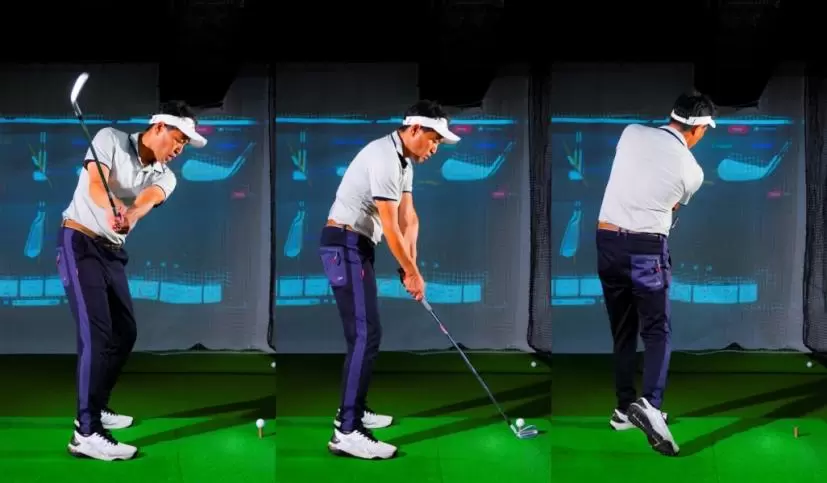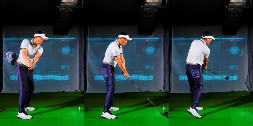 クラブをつまんで腰から腰の振り幅で、クラブと体が連動しているか確認。