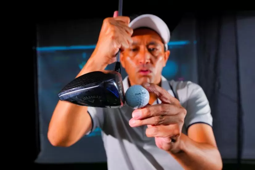 ドライバーも下のほうのスコアラインでボールの赤道を打つ練習をする。