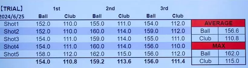 GCQuadで計測/Ball SpeedとClub Speedの単位はmph(マイル/時)。ヘッドスピードが110.8mph(約49.5m/s)から115mph(約51.5m/s)に上がっている。