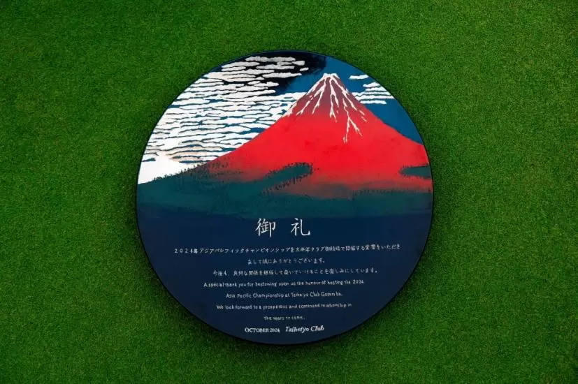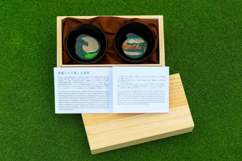 葛飾北斎の富嶽三十六景「凱風快晴」がデザインされたお盆が贈られた。