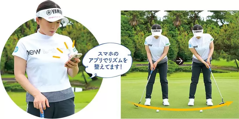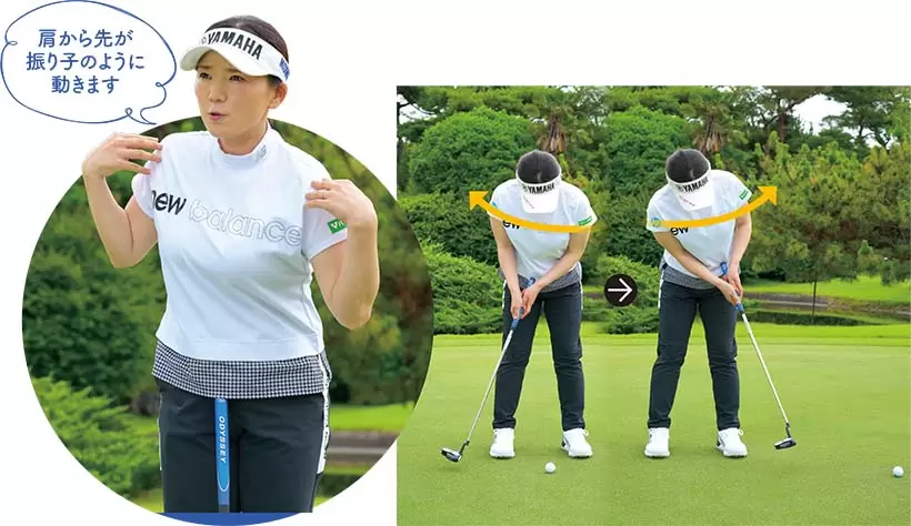 軽く上体を前傾させたら両腕をダランと真下に垂らし、その位置でパターを持つ。