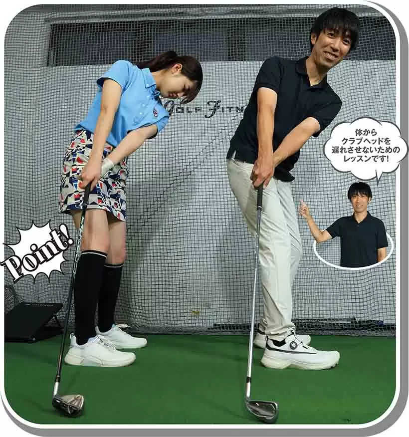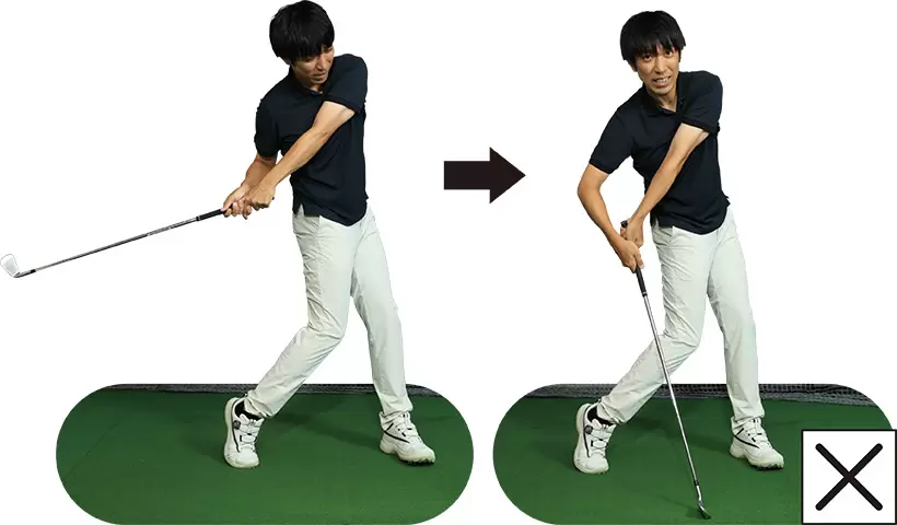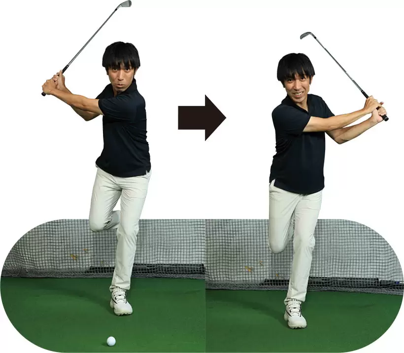 (写真左)ボディターンの意識が強すぎます(写真右)もっと腕を走らせるダウンスイングがいい!