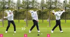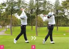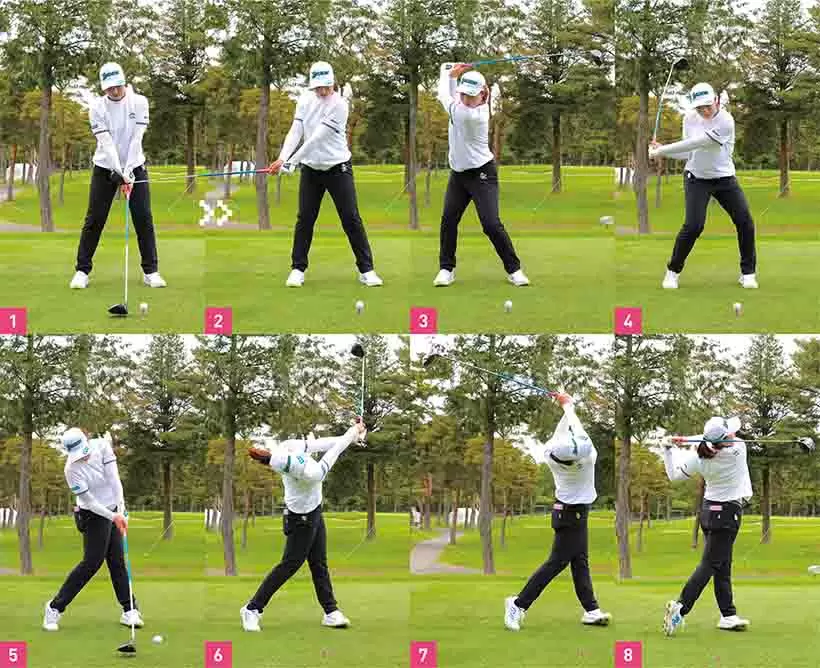 ダウンスイングでは左足を早めに踏み込みながらお腹を凹ませることで、下半身のパワーを使いながら上半身を回している。左肩を後方に回しながらインパクトすることによって、右肩が低い位置を通りながらタテに回転する。左ヒザが伸びて、左足はカカト側に体重がかかっている。