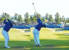 バックスイングでは両腕と手元の三角形をキープしているが、トップでは左腕を軽く曲げて腕をやわらかく使っている。