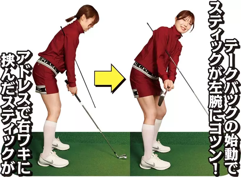 (写真左)右ヒジが伸びていきなり手元を高く上げすぎている(写真右)右ヒジを曲げて手元は上体と一緒に低く上げていく!